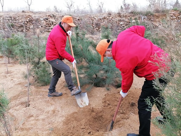 栽下棵棵樹苗,留下一片新綠。植樹現(xiàn)場黨旗、司旗、黨小組旗幟在風(fēng)中迎風(fēng)飄揚(yáng),植樹活動(dòng)中,一派緊張有序、熱火朝天的勞動(dòng)景象,大家個(gè)個(gè)態(tài)度積極、熱情高漲、干勁十足,揮鍬挖坑、運(yùn)送樹苗、扶植苗木、培實(shí)新土、提桶澆灌,大家比干勁、比質(zhì)量,各個(gè)環(huán)節(jié)銜接有序,樣樣做得認(rèn)真到位,大家樂在其中,配合默契,真正是勁往一處使、汗往一處流,一株株樹苗迎風(fēng)挺立,展現(xiàn)出勃勃生機(jī)。經(jīng)過熱烈有序的植樹勞動(dòng),共栽植側(cè)柏、油松苗木200余棵,順利完成了義務(wù)植樹任務(wù)。