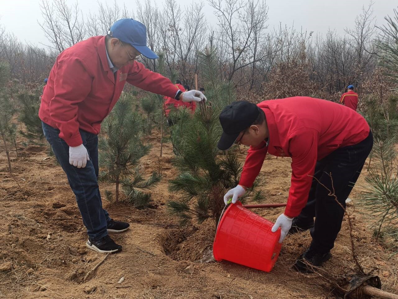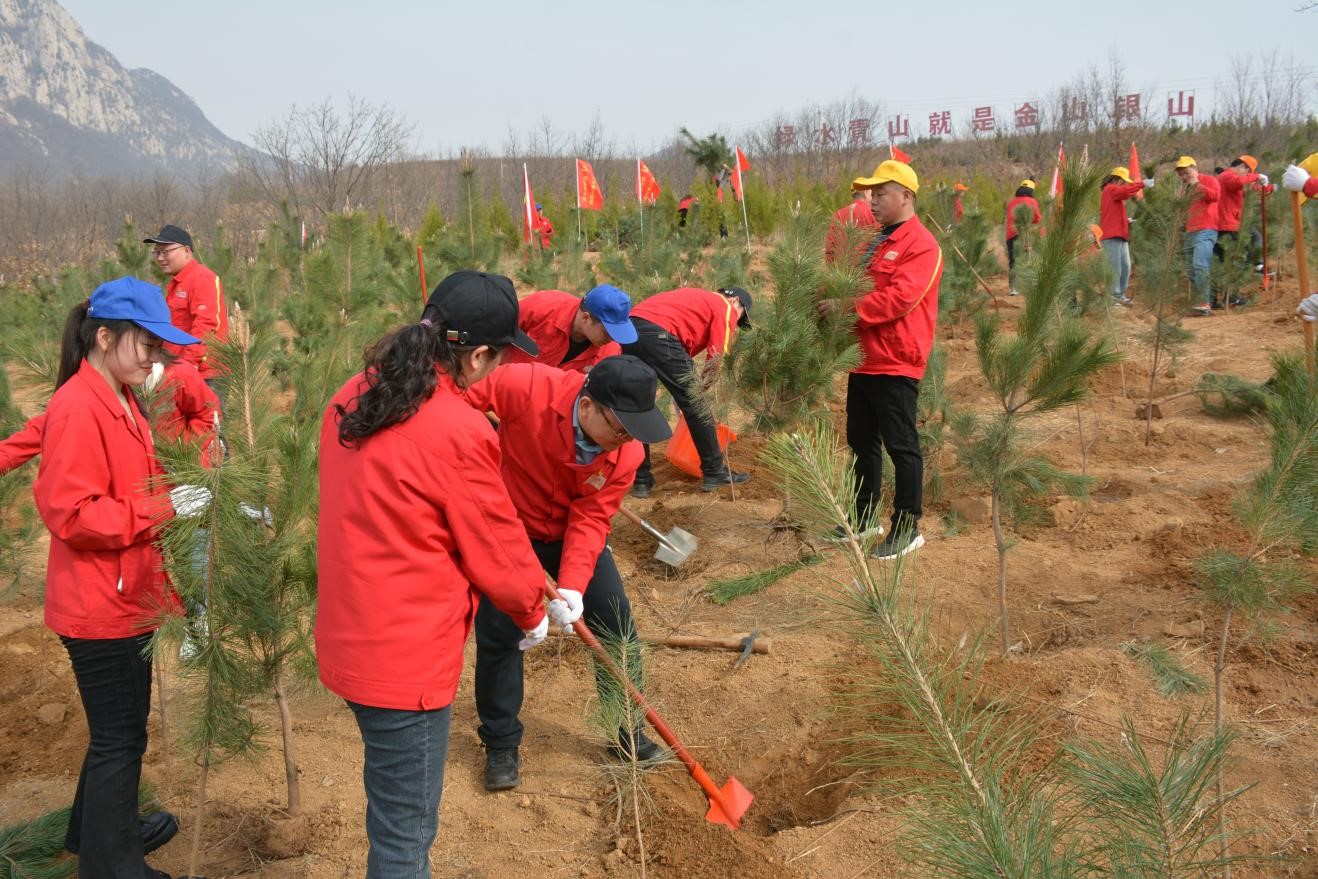 一桶清水,灌溉希望,一棵樹苗,承載未來。植樹現場黨旗、司旗、黨小組旗、團旗在風中迎風飄揚,植樹活動中,大家熱情高漲、干勁十足,全體參加人員發揚不怕苦、不怕臟、不怕累的精神,分工協作、揮鍬鏟土、扶樹填坑、踏土夯苗、提水澆灌,有條不紊地完成植樹各個環節。經過大家一上午的共同努力,一株株新栽種的樹苗迎風挺立,為大地增添了勃勃生機。