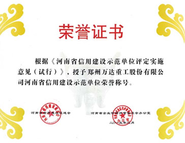 2016/01/28 558 熱烈祝賀鄭州萬達重工股份有限公司通過了河南省信用建設促進會和河南省企業信用評審委員會辦公室共同組織的河南省信用建設示范單位復審認證,被認定為河南省信用建設示范單位榮譽稱號!