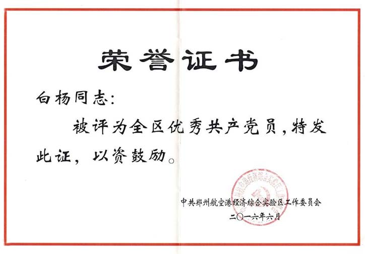 熱烈祝賀公司黨支部組織委員白楊獲得“鄭州市航空港經濟綜合實驗區優秀共產黨員”榮譽稱