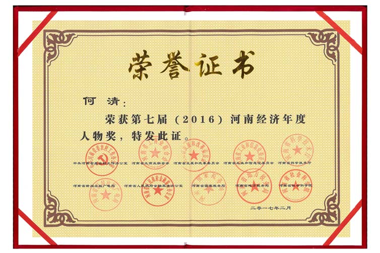 熱烈慶祝公司董事長書記何清先生榮獲 第七屆(2016)"河南經濟年度人物"