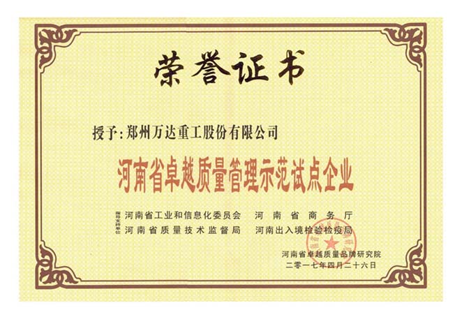 熱烈祝賀鄭州萬(wàn)達(dá)重工股份有限公司榮獲由河南省工業(yè)和信息化委員會(huì)、河南省商務(wù)廳、河南省質(zhì)量技術(shù)監(jiān)督局及河南出入境檢驗(yàn)檢疫局等單位共同指導(dǎo),河南省卓越質(zhì)量品牌研究院組織評(píng)選認(rèn)定的“河南省卓越質(zhì)量管理示范試點(diǎn)企業(yè)”榮譽(yù)稱(chēng)號(hào)。
