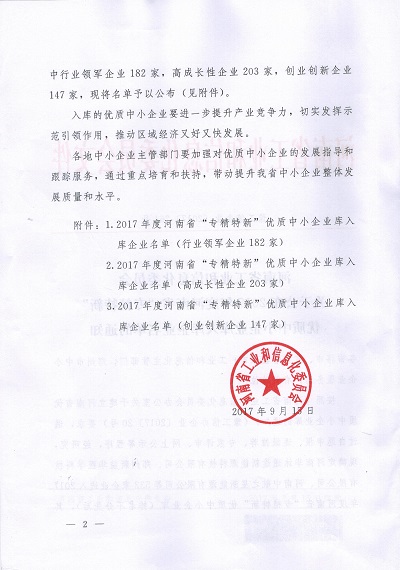按照《河南省工業(yè)和信息化委員會(huì)辦公室關(guān)于建立河南省優(yōu)質(zhì)中小企業(yè)庫(kù)的通知》(豫工信辦企業(yè)【2017】20號(hào))的要求,經(jīng)過(guò)自愿申報(bào)、逐級(jí)推薦、專家評(píng)審、網(wǎng)上公示等程序,鄭州萬(wàn)達(dá)重工股份有限公司成果入選河南省“專精特新”優(yōu)質(zhì)中小企業(yè)庫(kù),被認(rèn)定為行業(yè)領(lǐng)軍企業(yè)。