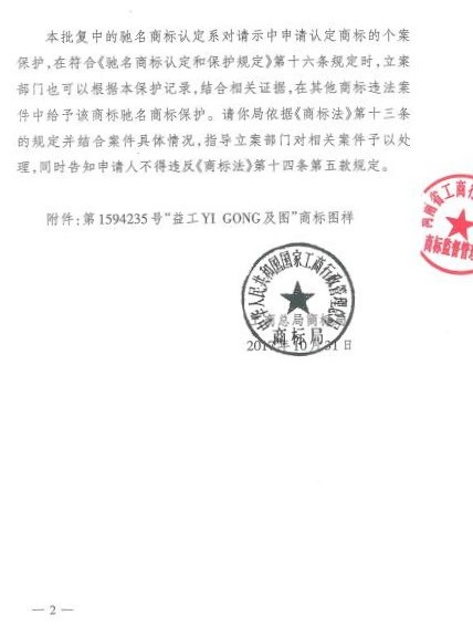 根據國家工商行政管理總局商標局下發的商標馳字【2017】108號《工商總局商標局關于認定“益工 YI GONG及圖”商標為馳名商標的批復》文件,公司使用在商標注冊用商品和服務國際分類第6類金屬管道配件商品上的“第1594235號益工YI GONG及圖”商品被認定為中國馳名商標”,這不僅是公司商標保護的重大成果,也實現了鄭州航空港經濟綜合實驗區馳名商標零的突破。