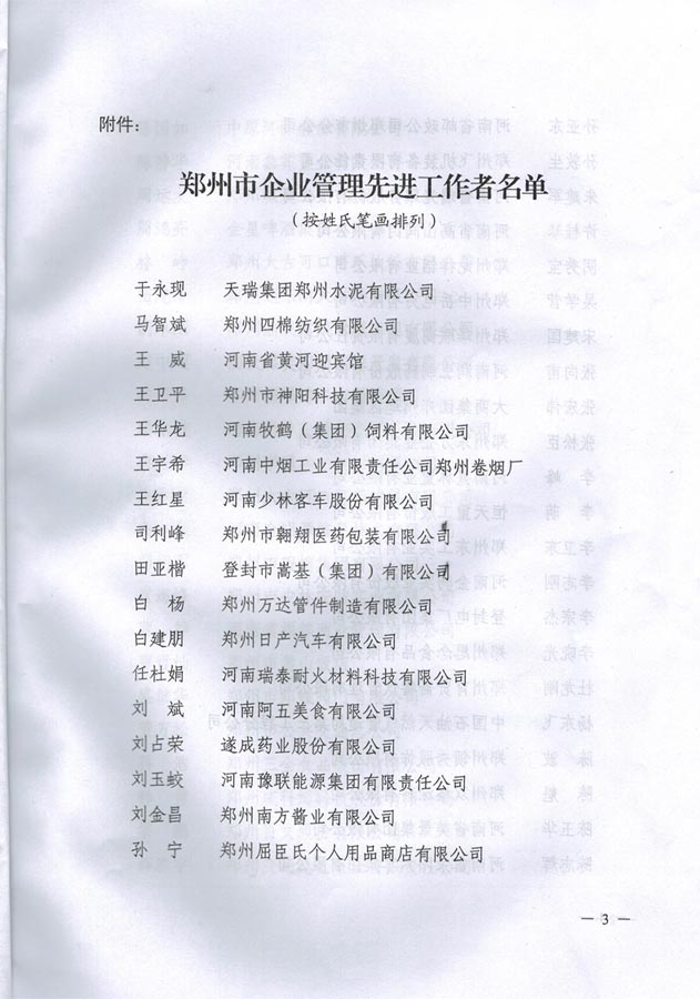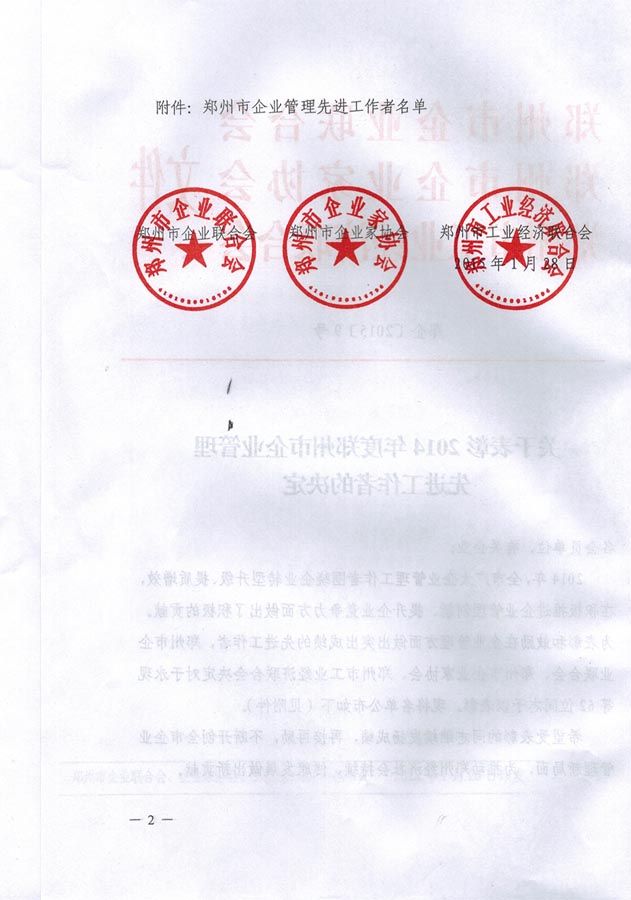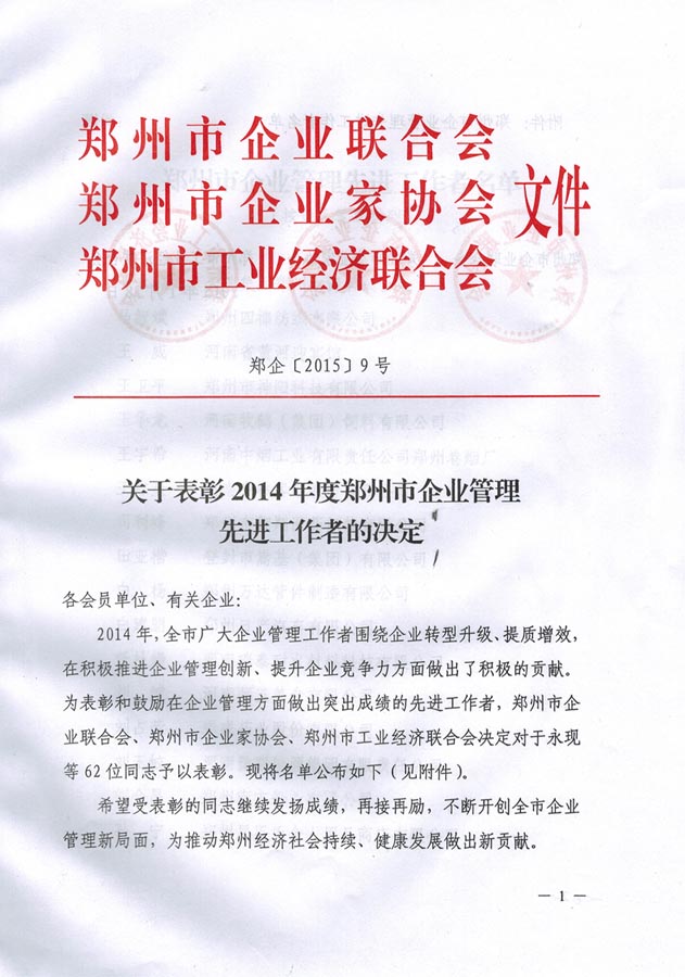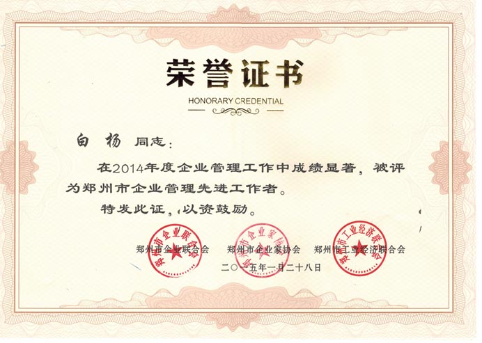 熱烈祝賀我公司白楊同志獲得鄭州市企業管理先進工作者稱號